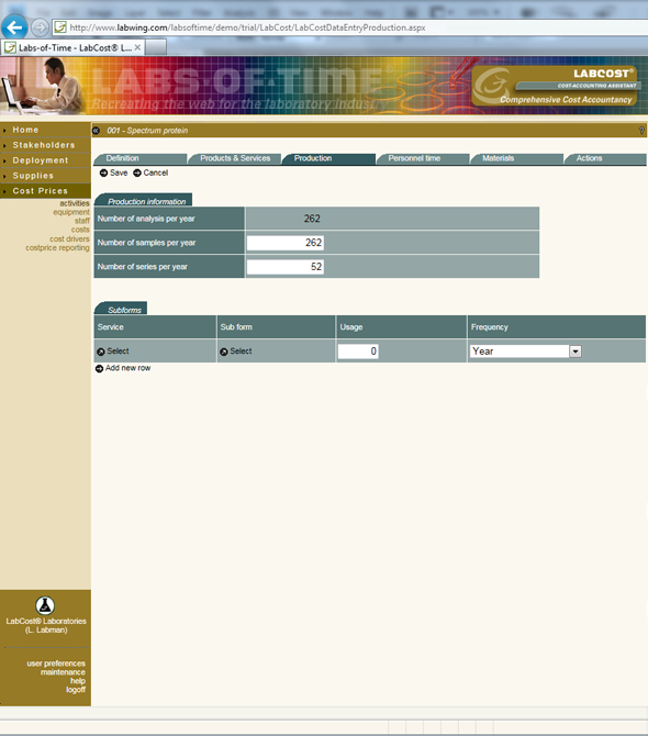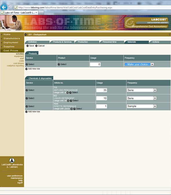 Usage The cost price form is linked to the appropriate analysis, methods and sample materials. Production volumes and frequencies are showed per period. Then he indicates the usage of materials based on the relevant work instructions.