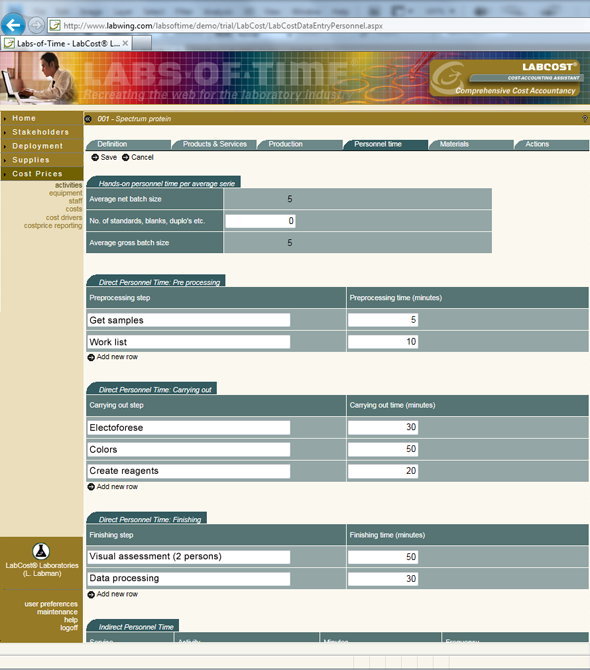 Staff time The departmental laboratory manager is responsable for the maintenance of digital cost price forms, that are based on the analytical production process. The departmental laboratory manager estimates the hands on time per average serie together with his departmental staff.
